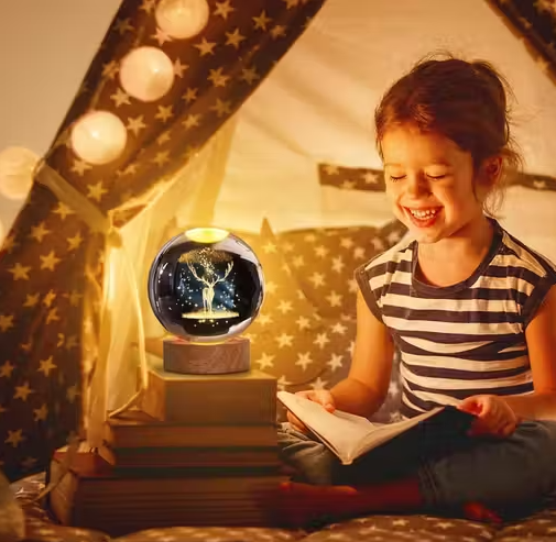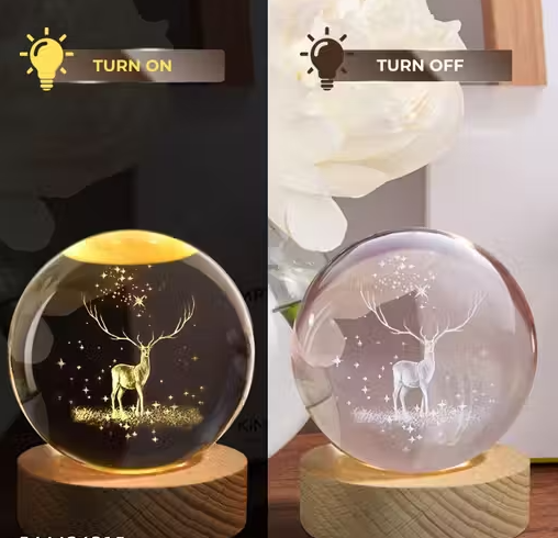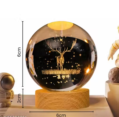 Transform your space with the mesmerizing 3D Engraved Deer Crystal Globe Lamp. This stunning table lamp features a beautifully detailed 3D engraving of a serene deer within a crystal globe, creating a captivating warm white glow that enhances any bedroom or living space. Set on an elegant wooden base, this lamp adds both charm and sophistication to your decor. With its compact 6 cm size, it’s perfect for bedside tables, desks, or cozy corners, making it an ideal gift or a personal treat for light lovers and nature enthusiasts alike.