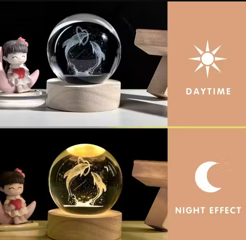 Illuminate your space with our mesmerizing 3D Crystal Ball featuring a stunning Dolphin figurine, beautifully set atop a sleek LED wooden base. This enchanting paperweight serves not only as a functional desktop accessory but also as a captivating piece of decor that brings a touch of elegance to any room. Meticulously crafted, the 3D laser engraving technique gives life to the intricate dolphin design, creating a delightful visual effect when illuminated. Ideal as a birthday gift or a thoughtful present for ocean lovers of all ages, it embodies both grace and charm, making it a perfect addition to your collection or a treasured gift for someone special.